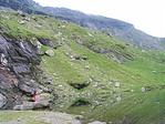 A szél és a hírtelen előbukkanó, majd majdnem ugyanolyan hírtelen semmivé váló köd miatt csak óvatosan és erősen kapaszkodva keresgéltük a ládát. Az esetleg nagyon rossz időjárási körülmények között keresők megsegítésére annyit azért még hozzátennék, hogy amikor már csak tízen méter választja el a piros jelzésű ösvényen közeledő keresőt a ládától, akkor a Bilea-tó irányába felkapaszkodva a sziklataréjra, majd onnan a taréj túlsó oldalán leereszkedve kb. két métert, kis túlzással szinte azonnal beleszorul a lába a leírásban is szereplő sziklarepedések egyikébe. És innentől már könnyű dolga van:-)