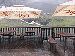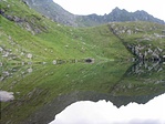 A kék háromszögön ereszkedtünk lassan a tó felé, mikor egyszercsak menydörgést hallottunk, majd egy sziklakibukkanás után megpillantottuk az északi völgyből felfelé gomolygó, sötétszürke falként tornyosuló felhőket. Nosza, nekiiramodtunk. Láttuk közeledni az esőfüggönyt és egyre inkább felettünk zengett az ég, de azt reméltük, még pár kanyar és épp besurranhatunk szárazon a bilea-tavi turistaházba. Hát nem. Olyan gyorsan csapott le ránk a jégesővel érkező zivatar, hogy a pelerineket és esőkabátokat sem volt idő felkapkodni. Kb. 2 perc alatt ronggyá áztunk. Öt métert sem lehetett látni az esőben, lábunk alatt patakok indultak meg a csúszóssá vált törmelékes ösvényen. Körülbelül 10 perc múlva a háznál voltunk, de akkor már mindegy volt nekünk, a cuccainknak és a túramorálnak.