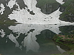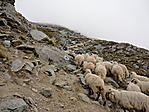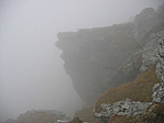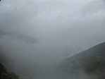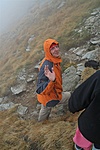 Beszélgettünk néhány túrázóval, akik már mászták a gerincet, (hallottuk, mikor beszélték) megvígasztaltak, hogy nem lesz ebből eső. Ők fenntről látták, hogy a felső fekete felhőből vagy jég, vagy hózápor lesz, mint néhány napja, úgy 10 cm vastagon! Dehát a nyeregben már arra godoltunk, hogy inkább felfelé. Közben a szél egyre hosszabb időre kiseperte a ködöt és megláthattuk a Capra-tavat. Körülötte a sátrazókat, az emlékművet és a felhajtott nyájat. Csak a csúcsot nem láttuk sosem.