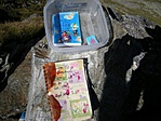 Ragyogó napsütésben, kék éggel, a szomszédos csúcson való gyönyörködés után kerestük és találtuk. A dobozban logbook nincs, csak egy A4-es papír, amit valószínűleg egy korábbi megtaláló pótlasként tett bele. Ezen jelszót nem találtunk, de a rejtő emailben hamar segítségünkre sietett.