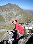 Logolás után fel, a pár méterre levő Iezerul (ejtsd: jézérul)-csúcsra. Az amúgy +11°C-os levegő napsütésben pillanatok alatt kellemesen felmelegedett, de mihelyt beborult, ismét lehűlt. Magas hegységben az időjárás képes pillanatok alatt gyökeresen megváltozni. Most is az történt, de a szokásostól eltérően nem elromlott, hanem egyszer csak elállt a szél, szinte teljesen megszűnt a ködképződés és tartósan ránk tőrt a napfény. Ettől pár perc alatt kellemesen felmelegedett a levegő. Így aztán közel három órán keresztül zavartalanul bámultuk a szemünk elé táruló csodálatos körpanorámát, majd lesétáltunk a tóhoz ebédelni.