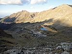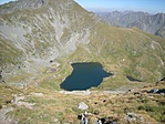 Elől a Bilea tó fekete vize, hátul a kis Capra tó a két eltűnt túrista emlékművével. Jobbra a "Buteanu Kéklő Csúcsa" a maga 2507 méterével, és a Capra Csúcs, mely csak 2494 méter. Balra kisebbek a csúcsok, és ha nem a kék háromszöget választod lefelé, a P- elvezet a Paltin csúcson át a Paltin nyeregbe, ahonnan kényelmesebb a séta le a Bilea Tóhoz.