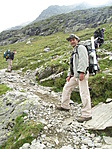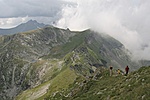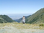 És így is tettek, majdnemcsak indultak, mire én kimásztam odúmból. A reggel ma is csodálatos volt, s most csatlakozott hozzá ez az érdekes érzés: egyedül maradni a hegyek között. Nem beszélsz, csak nézelődsz csendesen, szívod magadba a határtalanságot, a békét. S teszed a dolgod az elmúlt napoknak köszönhetően már rutinnal, meglepően könnyedén sikerült elpakolnom segítség nélkül a sátrat. Egy picit siettem is, szerettem volna még látni őket. A táborhelyről így másodiknak indultam - kb. 1 órával utánuk - még mindenhol álltak a sátrak. Éppen eltűntek a Laitel (2390m) túloldalán. Felérve úgy 10 percet hoztam rajtuk, ekkor már láttam, nem fogunk találkozni. Szeretem a hegyeket. Jóléreztem magam magamban a sziklák, kövek közepette. Egy-egy technikásabb részen - no semmi komoly, csak lánccal biztosított szakaszok - pl a Laita oldalában, még élveztem is magányom kihívását. A szembejövők is csodálkoztak, amikor egyedül köszöntöttem őket. Két óra alatt értem a Balea-tó fölötti gerincszakaszra, közben átjutva a Paltinului csúcson (2399m). Innen aztán csak megadatott még egyszer, hogy lássam őket, már egészen lent jártak a völgyben - úgy 300 méterrel alattam - ám nem hiába tanultam pijjogni, integettünk egymásnak. Ezen megnyugodva letelepedtem és főztem egy cappuccinót. Berniék elég hamar találtak fuvart, amit errefelé alkalminak hívnak, s könnyedén eljutottak Dévára, ahol megvárták az esti vonatot. Eljutottak egy étterembe, amit egy magyar ember vezet és igazán kellemes hely, melyet egy családi ház aljában alakítottak ki kis terasszal, az étel olcsó és laktató, ajánlották figyelmembe. (A címe: Alea Anemonelor 21, a hely neve Birtul La Baiatu restaurant.) Aztán fel s tovább, várt az ismeretlen. Hamarosan a Jezerelului oldalában araszoltam. Fentről (2417m) megláttam Zerge-tavat, ami egy újabb gyöngyszem a tengerszemek sorában. Leereszkedve forrásra leltem, ittam s közben ámulva merengtem a hullámokon játszadozó napsugarakra, a kis vízesésre, mely a tóba sietett. Átérve a következő völgybe váratlan kép fogadott, mégpedig rengeteg hó formájában, noha az út a gerinc déli oldalán haladt. Mégis vagy 4 óriási, elég meredek hófolton kellett átkelni. Élveztem. Előttem szintén egy magányos vándor haladt. Rákapcsoltam s rövidesen már együtt mentünk tovább. Peter Lischkának hívták és Prágából érkezett. 49 éves, két gyermek édesapja. Hegymászó, eddig 12 országban volt szerencséje mászni. Itt is járt 20 évvel korábban a Negojon, most eljött, hogy bejárja a keleti részeket is. Egyedül. Nagyon otthon volt a Közép- európai népek történetében, szóba került pl. 56, a Tisza, hogy régen ugye végig hazánkban folyt, már magyarul mondta a Felvidék kifejezést. Szóval jól elbeszélgettünk, azaz inkább én csak hallgattam s csak ritkán szólaltam meg elégtelen angoltudásom végett. De őt legalább értettem. A Zmeilor ablaknál ebédeltünk. Közben a délelőtti párából egyre inkább felhők lettek s mire elindultunk, elkezdett esni. Volt ott egy emberke, aki javasolta, hogy inkább a völgy felé menjünk, mint a gerincen - a villámok miatt - de Peter kemény ember volt, én meg vele tartottam. Ám elkövettem azt a hibát, hogy nem vettem fel az esőnadrágomat, így pár perc alatt eláztam. Szakadt, láttunk vagy 20 métert, így sajnos lemaradtam a Kis és Nagy-Árpás közötti egy méter széles gerincszakasz panorámájáról, örültünk, hogy az utat nem tévesztjük el. A Nagy-Árpás (2468m) oldalában állt el az eső, le is tettük a zsákjainkat, s felmásztunk a csúcsára. Sokat nem lehetett még látni, a felhők épp, hogy oszladozni kezdtek, de azért a legérdekesebbet, a Podu Giurguluit megcsodálhattuk. Ez egy pici tó, amit még teljesen hó vett körbe s nagy részét jég borította. Innen átmentünk a Mirciire (2461m), majd ereszkedni kezdtünk. Itt találkoztunk egy lengyel leányzóval, aki amilyen csinos volt, annyira egyedül volt és annyira egy szál cucc sem volt nála, magán is csak egy póló. Furcsán mutatott mellettünk, akik nyakig esőkabátba burkolózva, sapkában nyomultunk. A vihar alatt elszakadt társaitól, akik lehúzódtak valahová, és náluk volt minden felszerelése. A fentebb említett tó mellett már sátrazott 2 román srác, Peter hozzájuk ajánlotta be a tanácstalan leányzót éjszakára. Maga pedig úgy döntött szintén ott fog aludni, nem vállalja be a Podragu ház tömegét. Részemről azonban nem lett volna erőm felállítani vackomat, így elbúcsúztunk. Az ég közben kitisztult, a hegycsúcsok a lemenő napfényében fürödtek. S megláttam végre a Moldoveanut is, s reméltem másnap el is érhetem. Még szenvedtem egy nagyot, mire elértem a Podragu-nyerget (2307m), majd mire onnan leereszkedtem a menedékházba (2136m). Szerencsére kaptam helyet, egy 14 fős lágerban szállásoltak el, ahol nyolcadmagammal tölthettem az éjszakát. S végre újra magyar szót hallottam, itt voltak ugyanis kolozsvári barátaink. Ők is, mint a legtöbben a Zerge-tótól indultak aznap, azaz nem véletlenül voltam fáradt, hiszen kétnapi távot teljesítettem. Temesvárról is volt ott egy magyar ember egy másik csoporttal. Az előtér ablakában főzhettem, majd nagyot aludtam.