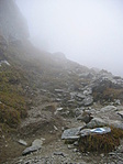A láda sajnos nem lett meg, mert a nyeregből elsőként a Buteanu-csúcsra mentünk fel, ahol rettentő nagy (jég)eső kapott el. A nagy ködben, égdörgés és villámlás közepette lesiettünk a hegyről. A lefelé vezető út hirtelen összefüggő patakká változott, mire bőrig ázva leértünk. Aznap már sajnos maradt is az esős idő.
