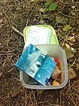 Sajnos gyógykészlet nem volt nálunk, a rejteken belül a láda ripityára van törve, el is van ázva. A logfüzet még olvasható, bár nedves, beleírni meg amúgy sem akartunk, a rengeteg szúnyog miatt...