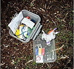 A rejtővel történt telefon beszélgetés után, a láda újrarejtve. Vitaminos csavarós doboz, belekerült, logbook, kis ceruza, kis mérete miatt némi ajándék (ami belefért), + a rejteknél őrt álló rózsaszin műanyag indián is beköltözött. :)