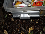 A nap második ládája. Igazság szerint nem hittük hogy rálelünk, mivel igen nagyon ránk sötétedett és se lámpa, se egyéb potenciális világító-eszköz nem állt sem ült rendelkezésünkre. Gondoltuk üsse kavics megpróbáljuk. Tök sötét volt és vagy fél órát kóvályogtunk a sáros, vizes, susnyásos talajon, ami eléggé horrorisztikus volt, de csak nem akaródzott megtalálni. Már-már kezdtük feladni, amikor Tamás rálelt. A mai nap második ládáját kalandos úton sikeresen megtaláltuk.