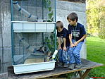 Én a park végigjárása után megvártam az esti etetést, ami azért is érdekes volt, mert egy rokonszenves, friss diplomás állatorvos leányzó etette a vidrákat az általa színes üveggyöngyökkel megtömött kárászokkal. Mivel Luca és Picur más-más színű gyöngyöt kapott, az ürülékük alapján követhető a mozgásuk, székelési gyakoriságuk, stb.