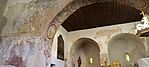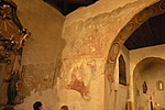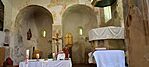 Körbejártuk a templomot, szemügyre vettük a (leginkább popsira emlékeztető) ikerszentélyt, majd becserkésztük a mikrocache-t. Már éppen indultunk volna vissza járművünkhöz, amikor észrevettük, hogy nyitva a templom kapuja: egy néni éppen friss virágokat tett a vázákba. Megengedte, hogy bemenjünk kicsit körülnézni. A fali freskók sajnos már elég kopottak, sokhelyütt lepattogzott a festék. A falakon több helyen felfedeztük a templomos lovagok jelét, a körbe rajzolt keresztet.