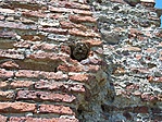 A torony különböző méretű téglákból áll, jelezve, hogy építészetileg nem egyöntetű, az évszázadok során újabb testek épültek be a falába.