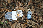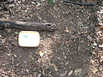 A rejtéshez közeledve, a kesser ösvényen haladva, egy fa tövében széttúrt ágdarabokat találtunk. Azt gondoltuk ez lehetett a rejtek és a láda eltűnt. Persze kicsit azért még szétnéztünk, hátha... A vékonyodó ösvényt követve, egy jellegtelen fa tövében avar alatt megtaláltuk a dobozt. Visszafelé, a vélt rejteknél megláttunk egy kis játékot, majd tovább kutatva egy másikat is. Ez igazolhatja, hogy itt lehetett az eredeti rejtés, csak azt valaki vagy valami ládástól széttúrta. A két kis állatot ide raktuk be és ágakkal takartuk, nem vittük vissza a dobozba.