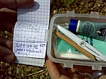 A láda lyukas, benne a papír elázott, amikor ott jártunk hangyák hemzsegtek rajta, körülötte és a rejteken, de ettől függetlenül az élmény megvolt, köszönet a rejtésért!