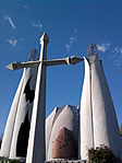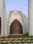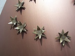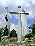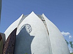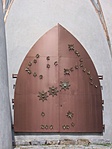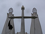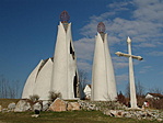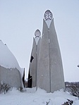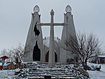 Messziről jól néz ki a kápolna, bár most a hóból kevésbé emelkedtek ki a fehér virágkelyhek. Közelről viszont kiábrándító a beton, a feltűnő összeeresztésekkel. A kapu bronz csillagai leáldozóban vannak, fogynak mint a közeli Beremendi-rög...