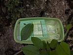 Nagy szerencsével lett meg. A rejtek üres volt, a dobozt jó 15 méterre találtam meg, ahogy a rét közepén hevert. Jóindulatúan feltételezem, hogy egy állat műve...