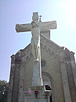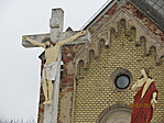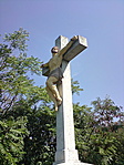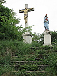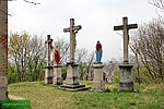 A csúcson a keresztrefeszített Üdvözítőt ábrázolják, jobbján és balján ugyancsak kereszten függő két latorral. Nem ritka, hogy kiegészítik Mária, Mária Magdolna, János evangélista alakjával a szoborcsoportot.