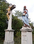 A kálvária együttes magas talapzaton álló öt életnagyságú festett horgany szoborból áll. Krisztus keresztjétől jobbra, ugyancsak magas talapzaton Mária, balra Mária Magdolna látható, valamint a két lator. A jobb oldali lator arca megnyugvást fejez ki, ezt erősíti lábainak párhuzamos állása. A bal oldali lator tehetetlen dühét fokozza a derékszögbe felrántott jobb lábszára, és magasba emelt jobb karja.
