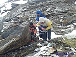Reggel 6-os indulást terveztünk, amit egyik társunk késése és vásárlása 1,5 órával eltolt, mivel késve érkezése ellenére még egy cba-ba is be kellett mennie kaját vennie. Gondoltuk ezt majd behozzuk valahogy, de ez nem igen ment, hisz elég szűkre hagytam mindent, kifelé is csak 3 megállás volt betervezve 5-10 perc pihenővel. A Wörthi tónál lévő pihenőnkig megdöglöttünk a melegtől az autóba, ott viszont már nem volt szép a tó, hisz elkezdett szemergélni az eső, és baromira be volt borulva. Lienz előtt már szakadó esőben autóztunk, egyre jobban lógó orral. Itt esett meg, hogy a napszemüvegem ami indulástól kezdve a fejemen volt, mivel féltem, hogy a csomagok között eltörik, hisz a rengeteg cucc miatt egy 4 keréken guruló szardíniásdobozban utaztunk, egyszer csak magától leesett a fejemről 3 darabba. Egy túratársamnak ugyanilyen szemüvege már ugyan így eltört ( úgy látszik a kereten erősen spórolt a cég), azt még én ragasztottam meg neki pillanatragasztóval. Most egyből adta magát a dolog, csakhogy vasárnap lévén ausztriában minden zárva.:-( Benzinkútról, benzinkútra zarándokoltunk, míg végre vagy a 6. kúton volt, potom 5 euroért.:-( Persze mivel a gleccserre igen ajánlott a napszemüveg, így kerül amibe kerül alapon, persze azért nem boldogan, de megvásároltam.:-) Gyors ragasztás és máris kifogástalan, csak szépséghibás, de ez nem igazán érdekelt.:-) Végül ezekkel a szívásokkal este 7-kor értünk Hinterbichlbe, úgy, hogy az ablaktörlő egyfolytában dolgozott. Gyorsan letettünk arról hogy még aznap feltalpaljunk a Defregger hüttébe. Bár még felmerült, hogy hívjuk a taxit, de akárhogy számoltunk este 10 előtt nem értünk volna úgy sem fel, és az idő is pocsék volt. Végül a településen szereztünk egy remek és olcsó szállást, majd esti időtöltésnek a szállástól kb 50 méterre lévő com-os tb hotelre vetettük rá magunkat. Itt begyűjtöttem egy FTF találatot, amiben az a szép, hogy közel 700 km-re az otthonomtól lettem én az első megtaláló, és így megkaptuk az első megtaláló jutalmát is, egy fa cointot és nagyon finom pálinkát, ami ekkor igazán jól esett.:-) Na meg megnéztük a helyi erőművet is, ami épp csúcsra járatva volt, sőt a leömlő víz egy részét elterelték, hogy a turbina ne menjen szét, azt hiszem ez is jelzi milyen időben érkeztünk. Reggel felkelve épp szemerkélt az eső, így a taxi mellett döntöttünk. Az felvitt minket a Johannes hüttéig ( 2100m ) itt kiszállva majd megfagytunk a viharos szélben és a havas esőben. Beugrottunk a hüttébe ahol épp 4 mászó volt bent. Köszöntünk gutten tag, visszaköszönés, majd 2-3 perc múlva rájöttünk, ők is mi is magyarok vagyunk.:-) Ők épp lefelé jöttek már, elláttak jó tanáccsal, így tudtuk, hogy mindenki már tegnap lemenekült a Defregger hüttéből a szar idő miatt, ők megpróbálták a csúcstámasdást, de csak ketten jutottak fel közülük. Mondták az éjjel még 50 cm hó esett fent, így nem irigyelnek. Na és persze elláttak jó tanácsokkal is, ami nagyon hasznos volt, és ezúton is köszönjük. Az egyik jó tanácsuk az volt, hogy késő délutánig húzzuk meg magunkat itt lent, mert fent a Defreggerben a lágerszálláson 2 C van, szóval nem vidám a helyzet ilyen viharban. Így itt még elszórakoztunk, bízva abba, hogy közben az idő is javul, majd nekivágtunk. Felfelé menet pont a pofánkba fújta a szép a havas esőt, majd fentebb érve a hódarát. Mi a málhánkkal meneteltünk rendületlenül, majd láttunk 1 mormotát, az is biztos csak véletlenül tévedt ki a lyukából, vagy lehet meg akarta magának nézni ki ez a pár hülye aki ilyen időben itt cipekedik felfelé.:-) A kövek egyre csúszósabbak voltak, a vége felé már helyenként lábszárközépig jártunk a hóban, de este 6 után csak felértünk. Bent tényleg nem volt meleg, és még vizet is kellett gyártanunk, bár ebben is sokat segített a 4 srác még lent, hisz mondták, hogy ők itták a wc-ben lévő vizet amire rá van írva, hogy nem iható, de semmi bajuk. Valószínű a felirat az étterem forgalmát hivatott bővíteni. Megkaptuk az "ágyainkat" lecuccoltunk, majd várakoztunk. Egyszer csak elállt a havazás, egyből ki beindítani a gázfőzőnket és vizet forralni levesnek. Ez sem ment egyszerűen a viharos szélben, mert előbb sziklákból egy szélvédett helyett kellett építenünk. Kb fél óra és gyöngyözött a víz, Laci szerint ez még nem forrás, de mi meggyőztük, hogy az már forr, hisz az éhes túratársnál nincs veszélyesebb.:-) Így mindenki megkapta a bögréjébe a leveshez való vizét, és már tettük is fel a következőt teának. A levesünket még meg sem ettük és ismét hóvihar kerekedett, így a teáról és konzervmelegítésről letettünk. Majd mivel a lágerszálláson 2 C volt úgy döntöttünk nem vacogunk így lefeküdtünk, persze ruhába és még a sapkát is magunkon hagytuk. Közben jött 2 cseh egy apuka és a kb 14 éves fia, meg egy 5 fős osztrák fiatalokból álló társaság. Reggel felvirradt a nagy nap, gyors pakolás és már indultunk is 5:45 kor. Láttuk ahogy mi készülődtünk a csehek is elkezdtek, látszott kötélparti társaságot keresnek. Ahogy mentünk fel a gleccserbeszállóhoz jöttek mögöttünk. A beszállópontnál mi vacakoltunk, hisz Emese hágóvasát is nekem kellett feltennem, és Zoli sem látott még ilyet így utána neki is kellett némi segítség, így a csehek hamarabb kész lettek és elindultak. Ekkor jött az 5 osztrák fiatal egy helyi vezetővel kiegészülve, na ők kb 3 perc múlva már a gleccseren is mentek, hisz a vezetőjük kb 2 perc alatt felakasztotta rájuk a kötelet és hágóvas nélkül indultak. Kicsit más útvonalon mint a csehek, ők igyekeztek szintbe maradni. Mi mikor elkészültünk őket kezdtük kö