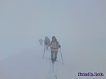 A ház fölött meglátod az ösvényt, azon fel és ahol a tábla jelzi a beszállást ott kötözködjetek össze. Ha jönnek helyi vezetők csoporttal figyeljétek, ha nem vesznek hágóvasat ti se vegyetek, csak menjetek összekötve 50-100 méterre a nyomukba. Ha épp nincs ilyen csoport akkor azért erősen ajánlom a hágóvasat is! GPS-el nem egy nagy kunszt végigmenni, de ha nincs másik parti, és lemerülne, no és köd is lenne, akkor a kolomp hangja irányt mutat, bár én tanácsolom a pótelemet, gps-el azért sokkal könnyebb. Elvileg kitaposott nyom vezet, de ha erős szél jön azt úgy befújja, hogy csak a gps vagy a kolomp segít rossz látási viszonyok között.