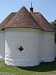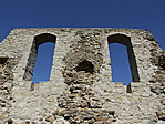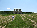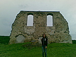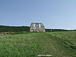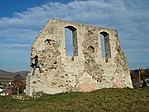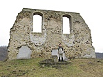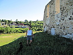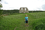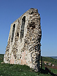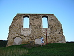 Ki tudja, hogy hányadik alkalommal járok itt?! Az biztos, hogy sokadik. Bár az utolsó alkalom óta is eltelt vagy 2 év. Viszont most vagyok először azóta, hogy a falmaradványt konzerválták és kicsit kiegészítették. Tudom, hogy utópisztikus a gondolat, hogy egyszer teljes pompájában láthassuk az épületet, de mégis jó néha eljátszani vele. A kihelyezett ismertetőtáblán láthatunk egy elképzelt rajzot róla. A kis templomot is körbejártuk. A három, karéj alakú szentély igazán különleges. Ahogy az erődítést jelentő fal is. a rom felőli oldalon az eredeti kapuszerkezet nyomai is láthatóak benne, meg jó néhány lőrés is. A rejtek is adta magát. Rossz hír viszont, hogy a teteje nincs a helyén. Feltehetően a helytelen használat következtében. Dudunak is tetszett, amit látott.