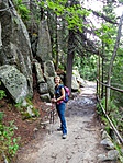 jelzésen haladunk. Az út nemsokára bevezet az erdőbe, ahol a fenyőfák mellett időnként táblákkal is találkozunk, az út ezen szakasza ugyanis erdei tanösvény is. Kb. fél óra gyaloglás után az út kettéágazik: jobbra a zöld