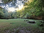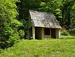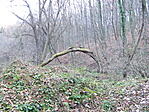 GCDOBO -t hamarosan ismét egy offroad pályára tévedtünk, és a padkáján egyensúlyozva lejtettünk lefelé az odafelé már érintett Kisújbányai FC egykori létesítményéhez, és innen borítottunk le a völgybe a forrás felé. AltSanyi memóriájában volt egy ösvény vagy erdővágás, mely toronyiránt pont a ládához visz, de ezt nem sikerült kikapni, ezért aztán a turistaúton mentünk, míg meg nem láttuk magunk alatt (természetesen itt sem függőlegesen, hanem srévizavé a felszíni domborzat szerint) a tisztás zöldjét. Na ekkor tényleg nekivágtunk toronyiránt, majd a tisztás fölötti erdőben elkezdtük módszeresen böngészni a fákat, mert sem a memorizált térkép, sem a rávezető utalás nem volt túl részlet gazdag. Még a Dobogónál felhasznált időnél is többre volt szükség, de végül siker koronázta erőfeszítésünket, s csodák csodája, a szellemes jelszót is tudtuk kötni a környékhez. (Köszönetnyilvánítás a