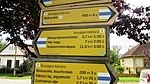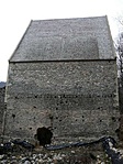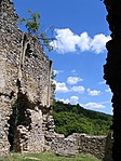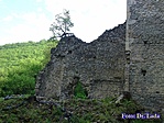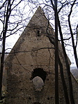 A javasolt parkolóban állt már egy autó, és a kissé feljebb levő bal oldali kiszélesedésben is kettő. Több parkolóhely nem látszott a keskeny út mentén, így inkább továbbmentem a szokatlan alakú, a környékről mindenhonnan látható TV adótoronyhoz. Hát, nem kicsit volt meredek! Szegény Opelem megkűzdött a 38 fokkal meg az emelkedővel! Visszafelé szerencsére egy autó már elment, így le tudtam parkolni. Egy röpke pillanatra megkísértett a gondolat, hogy a behajtani tilos tábla ellenére közelebb autózzak a romhoz, megtakarítva a 2x1,5km gyaloglást, de aztán mégse. Mint kiderült: igen jól tettem!