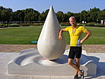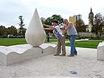 Egy nagyon szépen rendben tartott, régi épületekkel övezett, rózsalugasokkal, nagy zöld gyeppel bíró és szobrokkal teli parkot ismerhettünk meg, közepén a csepp alakú szoborral. Ha helyi lennék, biztosan ide járnék olvasni, elmélkedni vagy..., ki tudja. Jó volt itt lenni. Egy kis nyugalom a dübörgés közepette. A láda is gyorsan meglett. Dörmi medvémnek is tetszett.