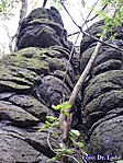 Klassz hely, a sziklák aljáról, toronyiránt mentem a ládához, szerintem így kevésbé veszélyes és a jó leírás miatt egyből jó helyre másztam. A rejtekből csoda, hogy nem csúszott ki/le a láda, néhány követ odatettem azért.