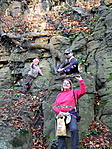 Igazi kirándulóidőben, mélykék hidegfrontos ég alatt, igaz kissé csípős, szeles levegőben vágtunk neki a pontok begyűjtésének. A legnehezebb az első stáció volt Királykővön. Még Reggel telefonos segítségét is igénybe kellett vennünk a megtaláláshoz. Fél kézzel egy gyökérbe kapaszkodva lógtam a sziklafalon, amikor a hívást eszközöltem. Szerencsére felvette és megerősítette, a sejtésemet, hogy nem éppen ott lógok, ahol kellene... :-)