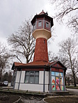 Több emelet magas, közel 15 méterre kiemelkedő építmény. A torony teteje 10 oldalú sokszög. Alapterülete 4x4 méteres négyzet. Belsejében három különálló szint található. Ebből egy a földszinti rész, a két emelet csak közlekedő, kis átjáró nyílásokkal és függőleges létrázottal a magasság leküzdése végett. A felső szinten kapott helyet a 20 m³-es téglafalú víztartály.