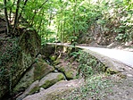 Itt jön a nap legértelmetlenebb szakasza: a kőszórásos rész. Jól ismerem ezt az utat, gyakran jártam erre, és a szurdok a híddal nagyon vadregényes, de ez a durva kőszórás teljesen élvezhetetlenné tette évekre. (Ki találta ki, hogy egy jelzett bicikliutat éles andezitzúzalékkal szórasson be?) Nem értem, miért erre kellett vinni ezt a biciklis multit! Ha a 2. pont kicsit feljebb lenne, lehetne nyugodtan az általam lefelé bejárt, jól biciklizhető úton vezetni ... Na mindegy, nem vagyok puhány: a biciklimet féltettem, így 2 km-en át részben toltam, de nagyobb részben a vállamon vittem a biciklit.