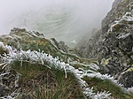 Két Kócs-hegységben tett kirándulás után ma folytattam a főgerinc bejárását: visszakapaszkodtam a Smutné sedloba, és onnan egészen a Brestovo csúcsáig követtem a gerincet. A hágóba felérve nagyon erős szél és köd fogadott, a fűszálakon vastag zuzmara volt, és minden meleg ruhámat fel kellett venni. Így mentem végig a Tri Kopy és a Banikov izgalmas, láncos gerincén. Aztán a Banikov csúcsán egy óra várakozás és vacogás után megjött a várva várt kifújás: szép lassan kitisztult minden, és egyre hosszabban sütött a nap is. (Ez is kb. 21 km-es kirándulás volt, jó sok szinttel, és ez is 9 óráig tartott - sok csúcson ücsörgéssel.)