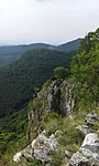 Az egykori multi (feltételezhető) pontjait már régen (de már a láda megszüntetése után) bejártam, a Pes-kő-barlangnál pedig már a gps-es idők előtt is voltam. A Pes-kő csúcsát általában meglátogatom, ha a déli köveken járok, és nincs költési szezon. Most a párás időben különös hangulatú volt a kilátás.