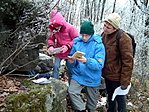 Az üdülő kéménye vidáman füstölgött, de az udvaron csak egy szakadt Lada Nivát láttunk, embert sehol. Persze biztosan bent élvezték a meleget. ;) Mivel igencsak kezdett sötétedni, és hideg is volt már, inkább gyorsan felszaladtunk a dombra a dobozért. Persze a műszer megőrült, fatönkökhöz és más fura helyekhez irányított, de végül csak sikerült az óriássziklákra ráakadnunk. :D A doboz is hamar meglett, csak hát a vendégmarasztaló hecsedli valószínűleg nem szereti a kessereket, így egy darabig eltartott, mire kibányásztuk.