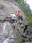A kb. 30 méter széles és 80 méter magas fal két szélén vezet fel egy-egy kiépített vasalt út, melyek fent összeérnek, vagyis olyan mint egy körtúra. :) A köztes rész egyébként a szikla mászók a terepe. Nincs igazán kijelölve a kötelező haladási irány, de ha már vannak a falon, akkor nem ajánlott szembe menni velük. Nincs sok kitérési pont. A tetőn ki lehet szállni, van valami turistaút is, ha minden igaz azon vissza lehet térni a parkolóba, de mi nem próbáltuk ki. A fal egyébként remekül mászható. Igaz a baloldali ágon néhol messze voltak egymástól a stiftek (egy gyerek szemszögéből), de a drótkötelet fogva nem volt zavaró.